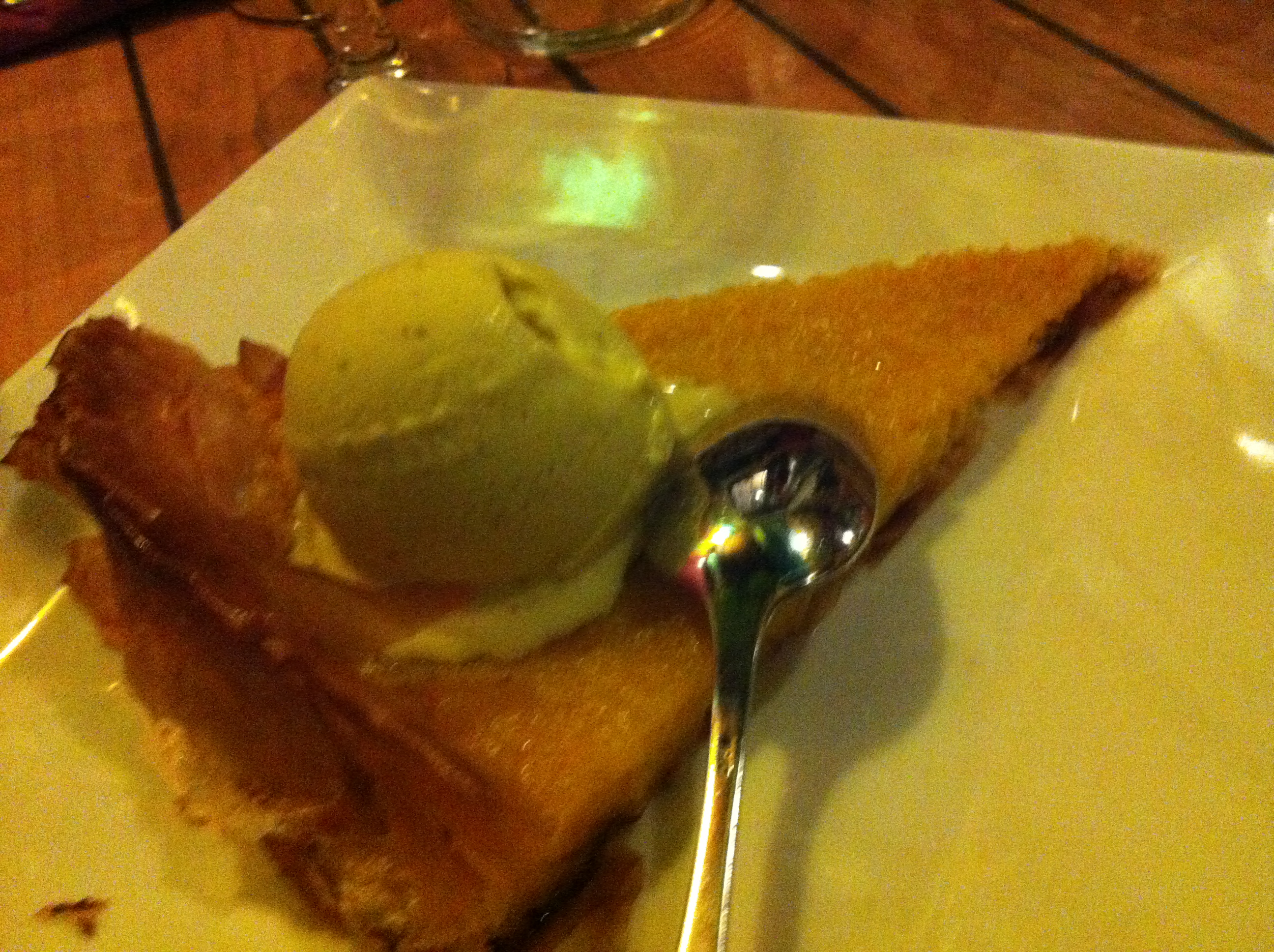- Dessert au choix : J’ai choisi le konafa que je ne connaissais pas : cheveux d’ange au cœur de pate d’amande au sirop de fleur d’oranger, que j’ai accompagné d’une boule de glace à la vanille me rafraîchir. C’était un dessert étonnant mais très équilibré en goût. Il y avait également une tarte à l’orange