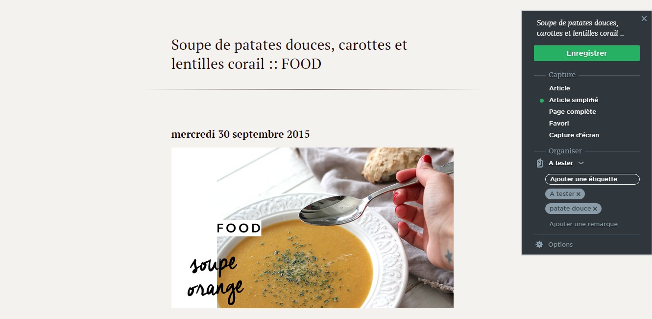 J’utilise surtout Evernote pour regrouper mes recettes de cuisine, et du coup cette petite extension est très utile quand je tombe sur une recette que j’ai envie de tester ! En un clic, je peux copier le contenu de la recette dans mon carnet et il se placera directement dans le carnet de mon choix.