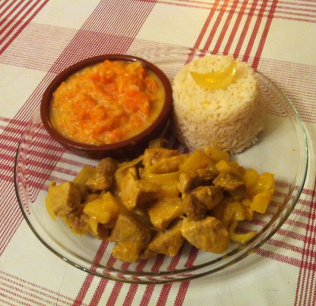 Les proportions : 600g de porc, 2 oignons, 1 boite d’ananas au sirop avec le sirop, et des épices (sel, poivre, sweet chili sauce (ou un peu de piment), gingembre, ail, curry). Faites revenir les oignons dans un peu d’huile, puis ajouter le porc et l’ananas, ainsi que les épices. Laissez cuire… jusqu’à ce que ça soit cuit ! (Disons 15 minutes). Je l’accompagne d’un écrasé de carottes au lait de coco (2 oignons, 700 g de carottes, faites cuire 30 minutes, puis écrasez en ajoutant 20 cl de lait de coco et 30 cl de lait).