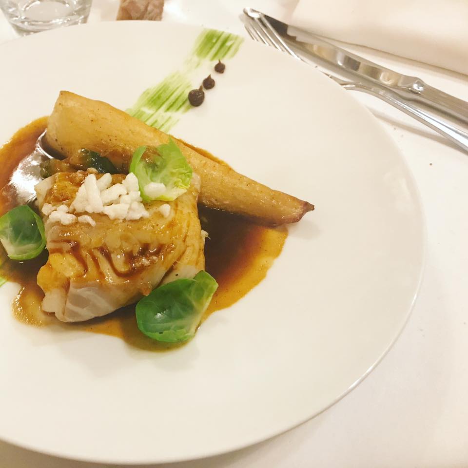Dos de cabillaud snacké, dattes et citron confit, panais rôti, choux de Bruxelles braisés, fumet brun au tandoori