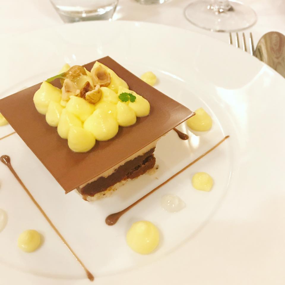 Mousseux chocolat Gianduja, praliné feuilleté, crème et sauce yuzu, dacquoise noisette, fine feuille de chocolat Azélia