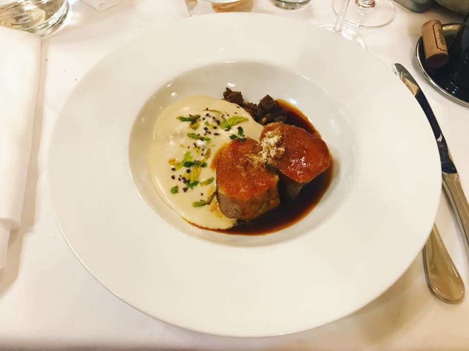 Quasi de veau rôti, pomme de terre au beurre de moelle, crumble pain de seigle, purée légère de châtaigne, jus de veau au Tio pepe