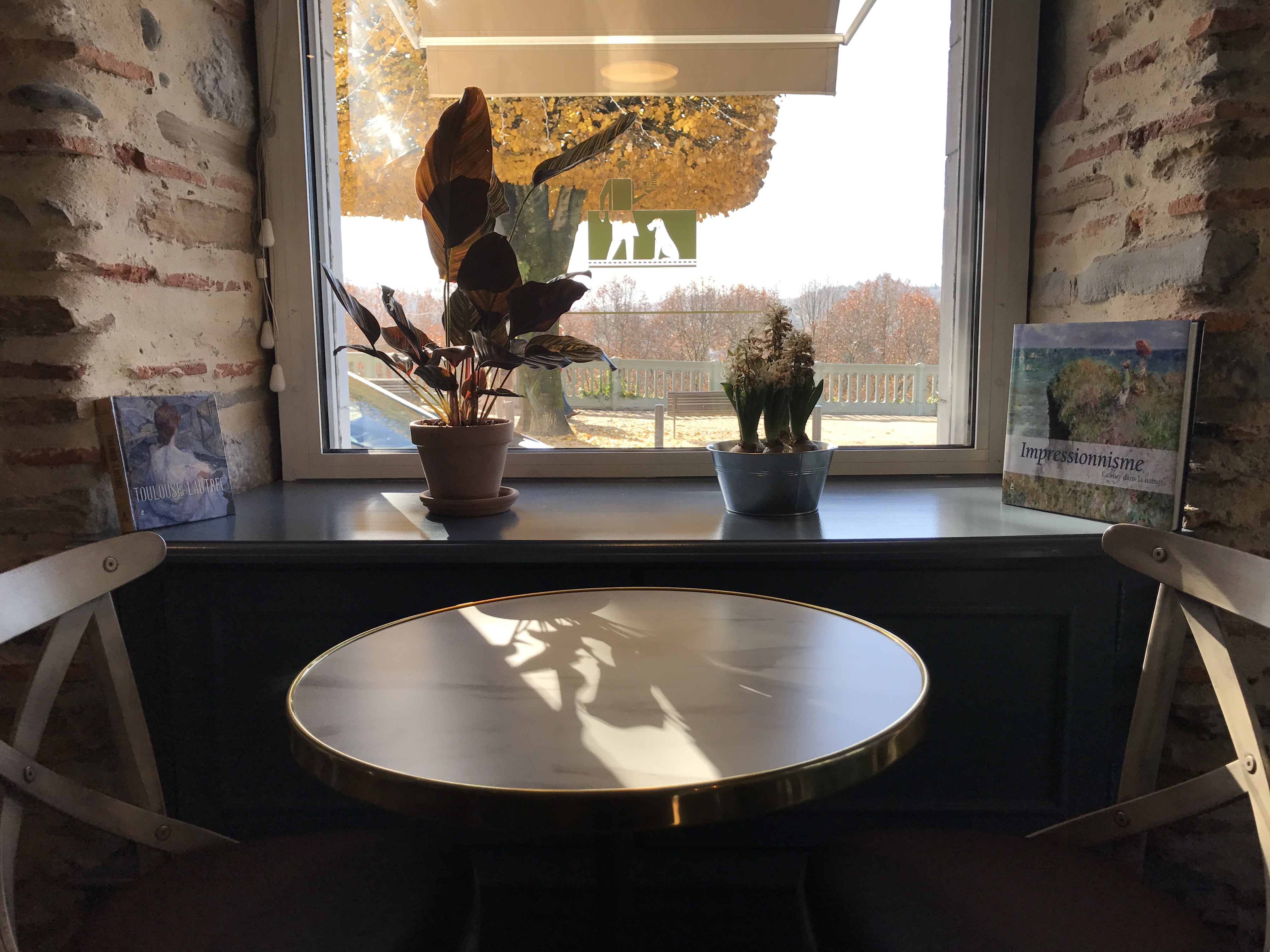 La terrasse les jours de beau temps, et le côté cocooning et chaleureux s’il pleut et qu’on va à l’intérieur